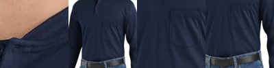 - Dyed to match rib knit henley collar