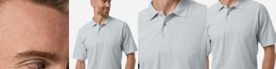 5 oz/yd², 60/40 cotton/recycled polyester pique Moisture-wicking performance UPF 40+ protection Active fit V-neck placket with matching knit collar Side vents Tear away label