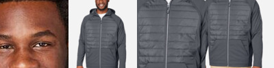 3.9 oz./yd²/132 gsm (US), 6.5 oz./L yd (CA) Shell: 100% polyester twill, with water resistant and cire finish Shell Lining; Polyester taffeta Liner Jacket: 7.7 oz Polyester anti-pill fleece Storm flap with hidden snaps at top and bottom Inside placket; roll-away hood; adjustable cuffs with tabs Lower concealed pocket with zippers and reflective toggles Audio port access through inside left pocket Thermal retention shockcord at hood and drop back hem Reflective piping at shoulder yoke and upper back panels Inside placket on liner Center-front reversible zipper Lower concealed pockets with autolock zippers Audio port access through inside left pocket